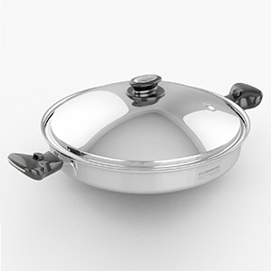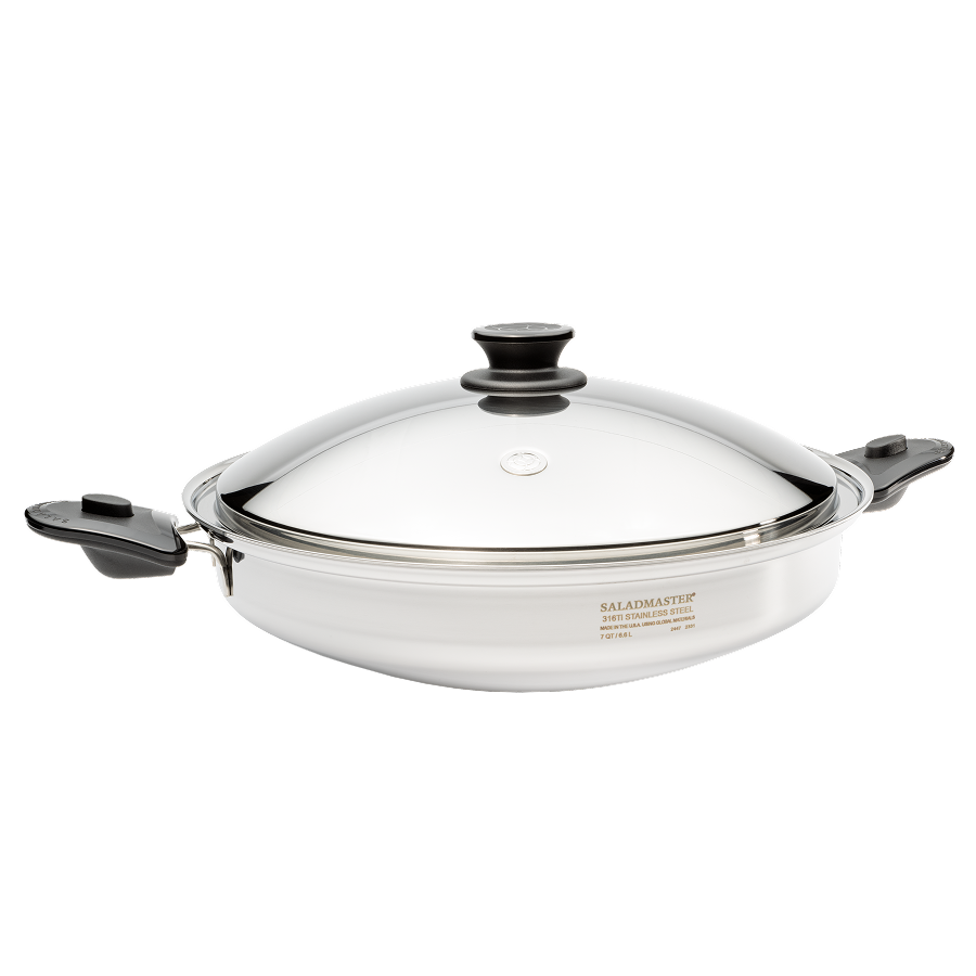 這款 Saladmaster 7 夸脫(約 6.6 公升)中式炒鍋,專為家庭份量或多人料理設計。寬闊的鍋面與高弧度斜邊設計,方便翻炒、燉煮或蒸製大量食材,能輕鬆應對各種菜式,是中式料理與快炒料理的理想鍋具。